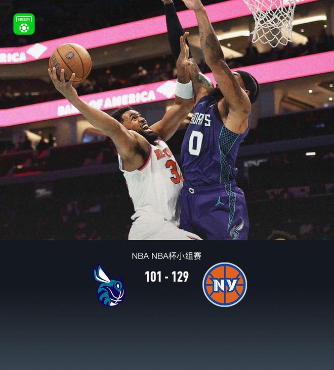 北京时间11月27日,NBA杯小组赛夏洛特黄蜂队对阵纽约尼克斯队。半场黄蜂队47-72领先尼克斯队,最终黄蜂队以101-129领先尼克斯队。夏洛特黄蜂队布兰登·米勒得到18分、4个篮板和3次助攻,迈尔斯·布里奇斯得到17分、4个篮板和1次助攻。纽约尼克斯队的布伦森得到33分2篮板3助攻,约什哈特得到22分8篮板7助攻。首节比赛,黄蜂队塞克斯顿拿下7分,尼克斯队约什哈特拿下11分。首节结束,黄蜂队31-37领先尼克斯队。第二节,黄蜂队的迈尔斯·布里奇斯得到5分,尼克斯队的约什·哈特得到8分。上半场结束,黄蜂队47-72领先尼克斯队。第三节,黄蜂队的布兰登·米勒得到8分,尼克斯队的布伦森得到16分。第三季度末,黄蜂队75-98领先尼克斯队。第四节,黄蜂队布兰登·米勒拿下5分,尼克·斯科莱克拿下7分。最终,黄蜂队以101-129不敌尼克斯队。夏洛特黄蜂队全场数据中,布兰登·米勒得到18分4个篮板3次助攻2次抢断,迈尔斯·布里奇斯17分4个篮板1次助攻,塞克斯顿15分1个篮板2次助攻。纽约尼克斯队的布伦森得到33分2篮板3助攻,约什哈特22分8篮板7助攻3抢断,唐斯19分10篮板3助攻。夏洛特黄蜂队首发阵容:布兰登·米勒、迈尔斯·布里奇斯、拉梅洛·鲍尔、卡尔克布伦纳、克诺佩尔。纽约尼克斯队:布伦森、约什·哈特、唐斯、麦克布莱德、米卡尔·布里奇斯。